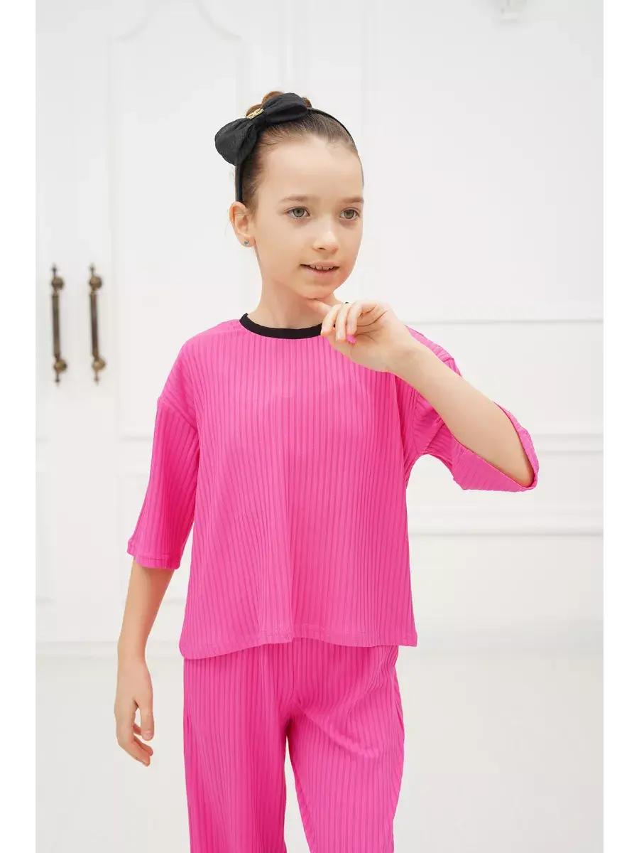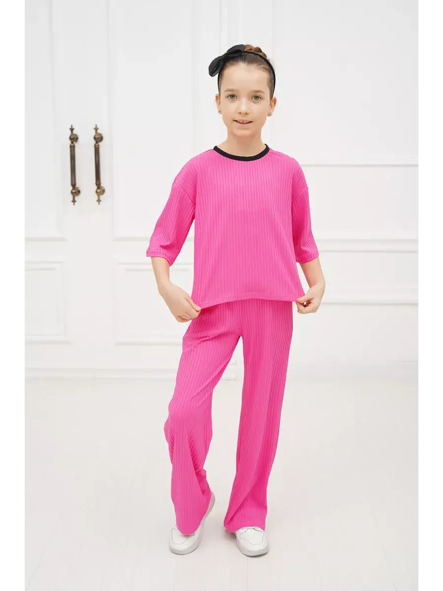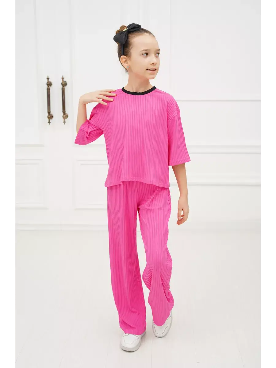 Костюм для девочки - идеальный вариант удобной детской одежды как для дома так и на выход. Стильный брючный костюм для девушек состоит из комплекта футболка и штаны (широкие брюки палаццо). Фасон оверсайз в подходит детям любой комплекции. Комплект одежды для девочки выполнен из гладкой и мягкой ткани лапша. Особенность летнего детского костюма - премиальная ткань, которая отлично тянется и не мнётся, поэтому Вашему ребёнку всегда будет удобно и комфортно в нашем костюме. Костюм пижамного стиля со штанами на эластичной резинке на поясе и футболкой с коротким рукавом. Костюмы нарядные детские представлены в модной цветовой гамме и отлично подойдут для дома, на вечернюю прогулку и в отпуске.Комплект двойка универсален и представлен в трендовых оттенках этого года. Он доступен в различных размерах, что делает его подходящим для подростков, миниатюрных девушек и женщин, так и для детей младшего возраста, посещающих детский сад. Прекрасный подарок на любой праздник.