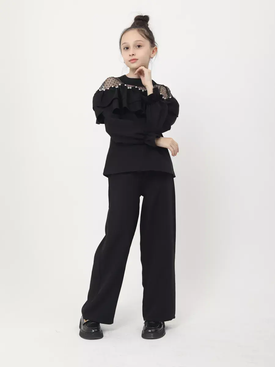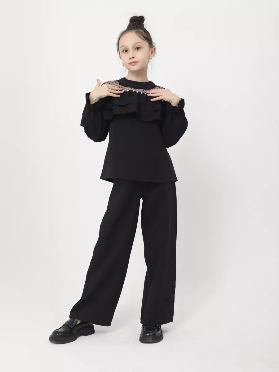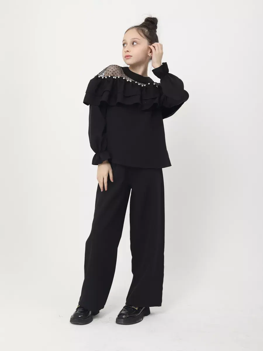 Костюм на девочку нарядный выполнен из брюк с высокой посадкой, блузки с модными воланами. Блузка для девочки станет украшением. Широкие Брюки палаццо будут удобны и при этом элегантны.Модель костюма отлично подходит для праздников, на Новый Год, на день рождения, 8 Марта, последний и первый звонок, вечерние мероприятия , прогулки по вечернему городу и в школу. Костюмы и комбинезоны данных моделей отшиваются из качественной ткани, которая после многочисленных стирок не образует катышек. При самых активных играх и танцах девочка в данном костюме не вспотеет. Эта одежда для девочек и подростков прекрасно садится на любой тип фигуры, скрывает её недостатки и выделяет преимущества. Нарядный костюм для настоящих модниц, в нем каждая будет выглядеть максимально стильно и эффектно.