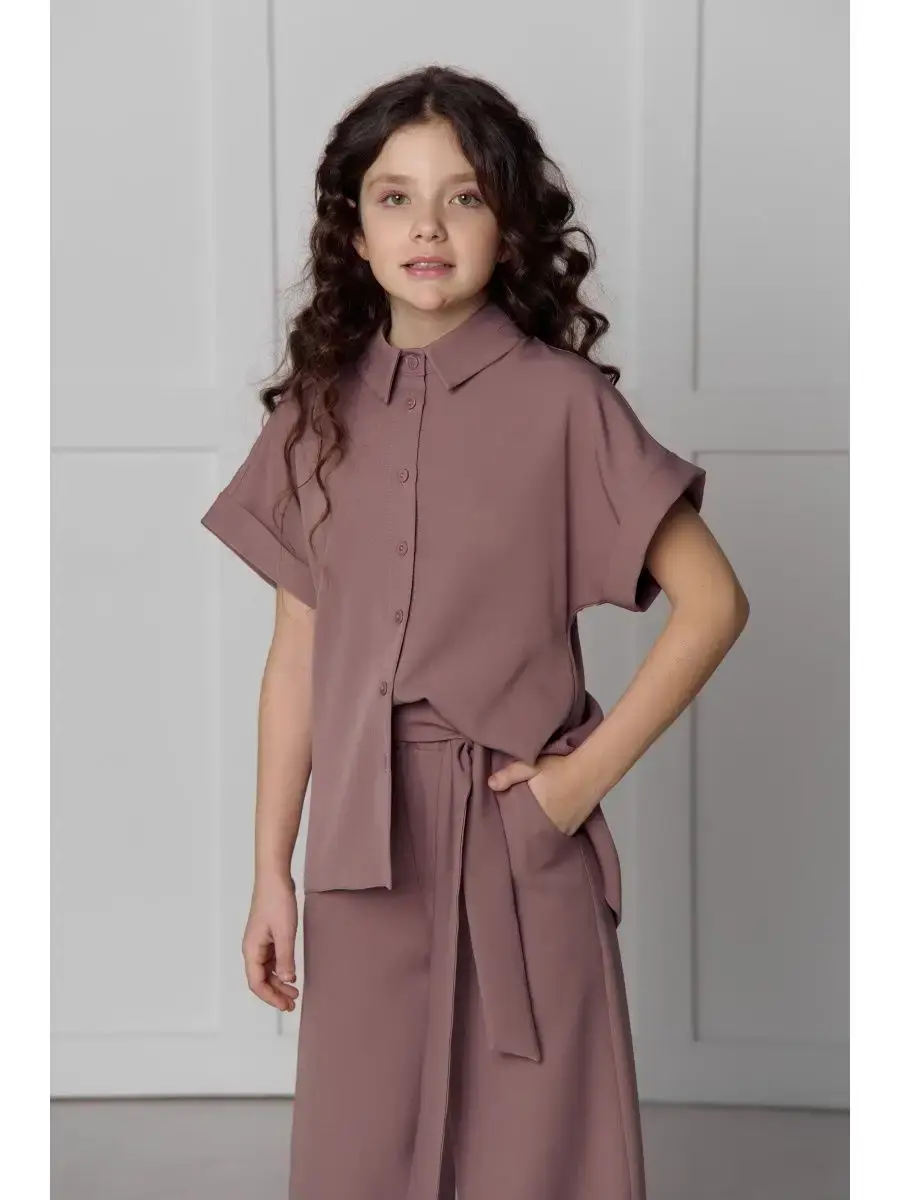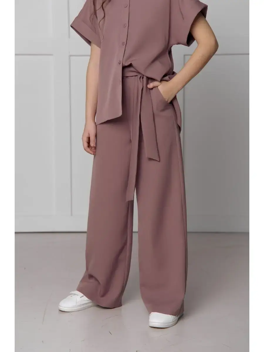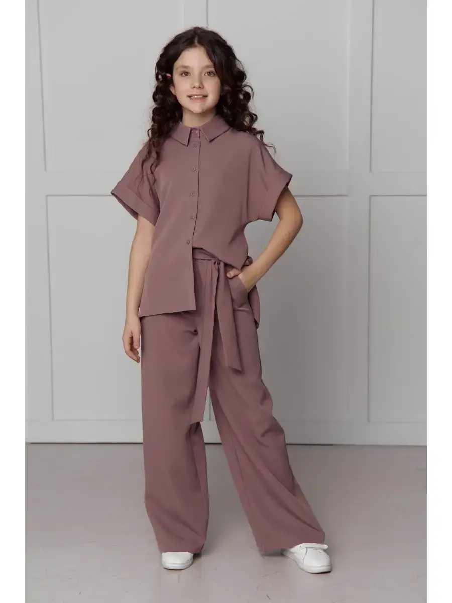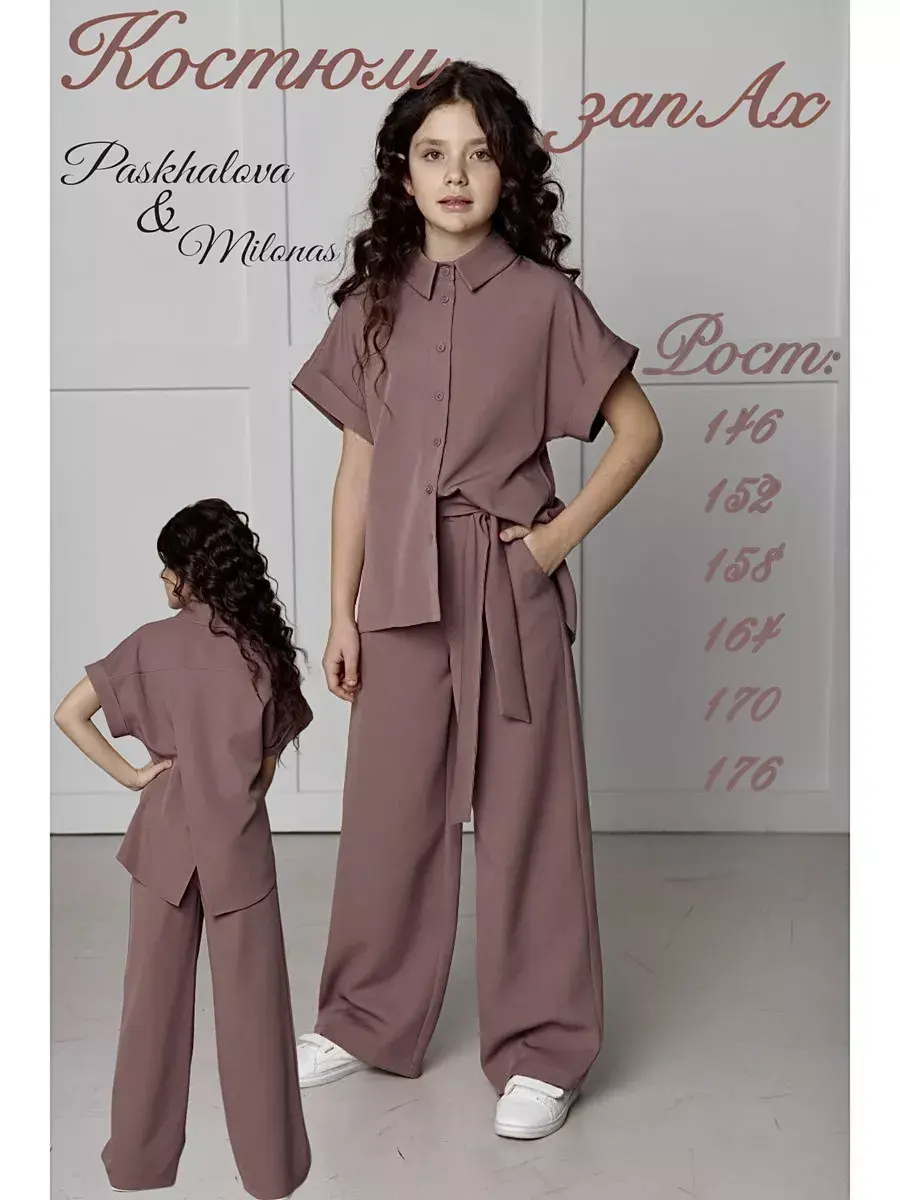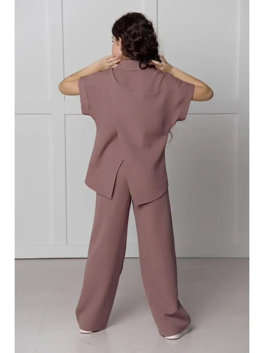 Блузка с оверсайз кроем и запахом на спине придает образу особую изысканность, а брюки-палаццо делают его еще более утонченным. Этот костюм идеально подойдет как для выпускного вечера, так и для школьного праздника или дня рождения.