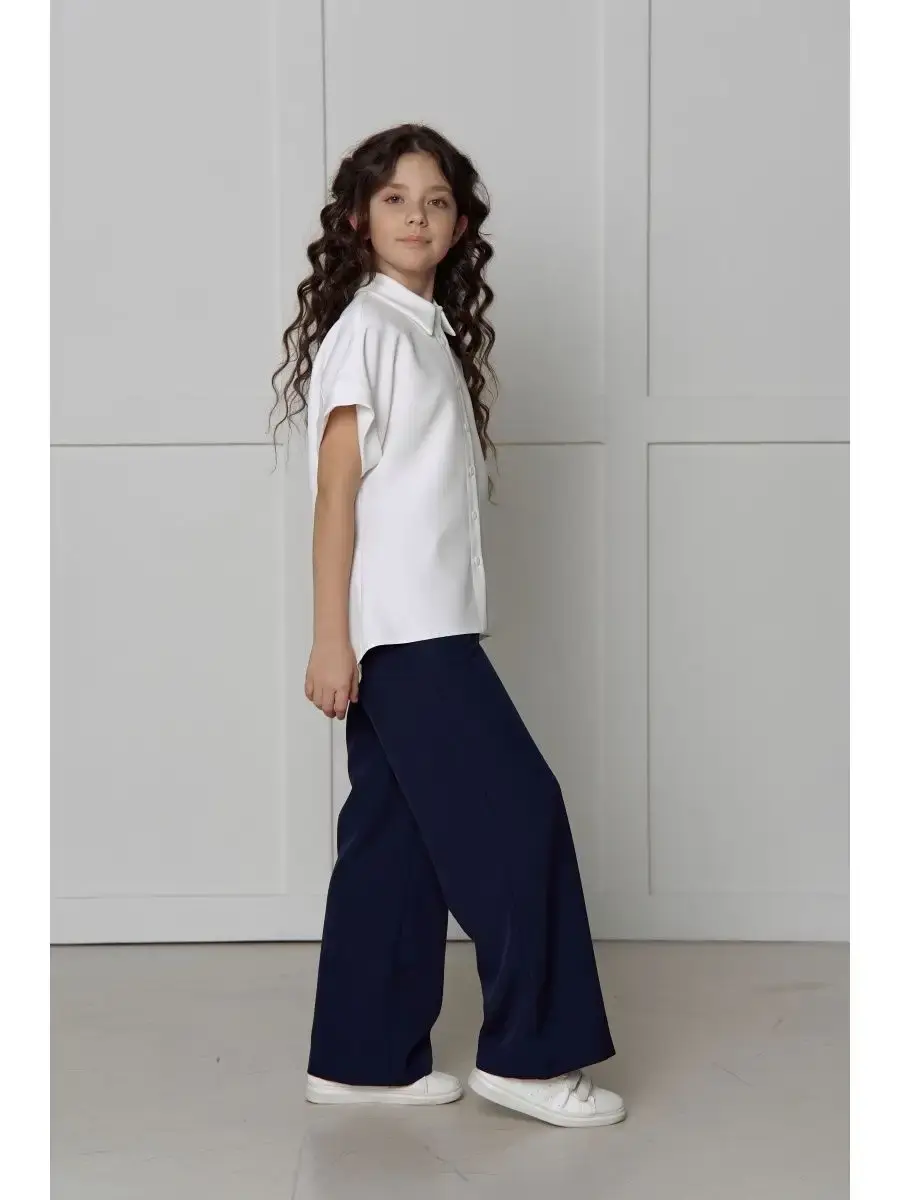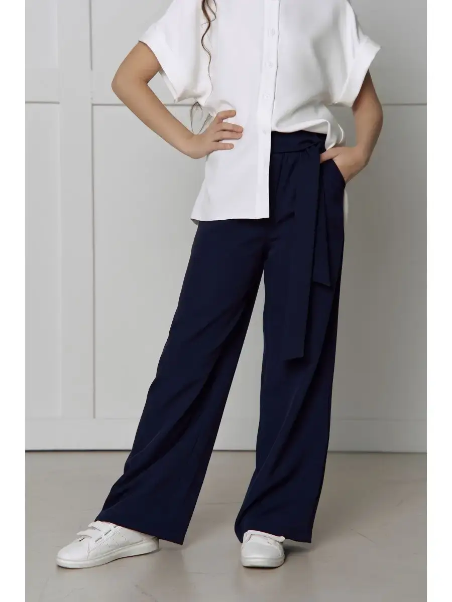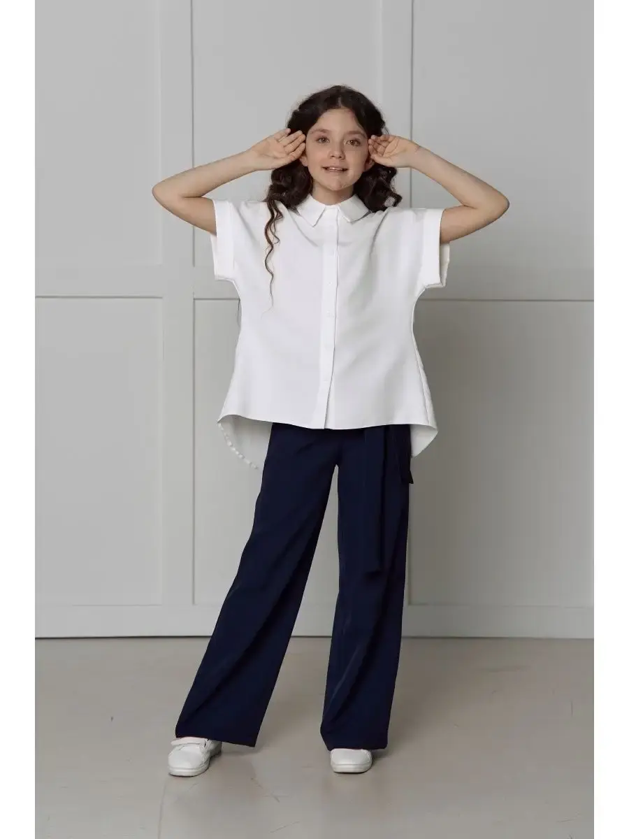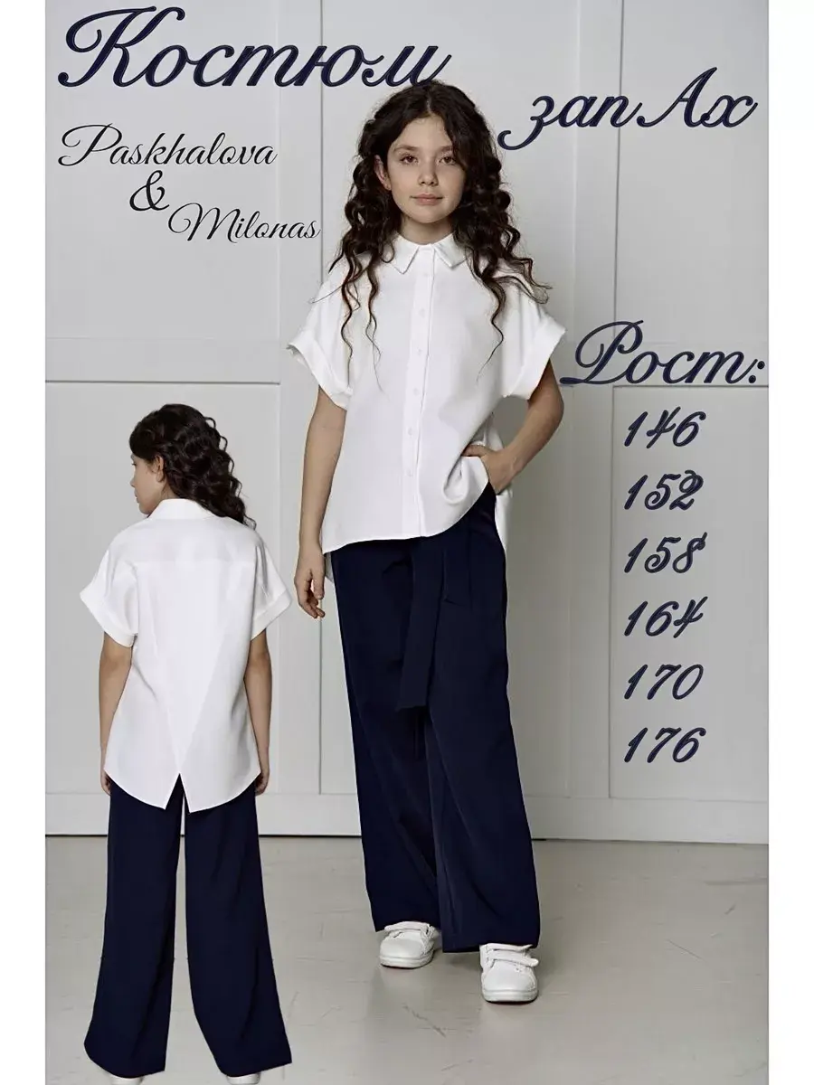 Блузка с оверсайз кроем и запахом на спине придает образу особую изысканность, а брюки-палаццо делают его еще более утонченным. Этот костюм идеально подойдет как для выпускного вечера, так и для школьного праздника или дня рождения.