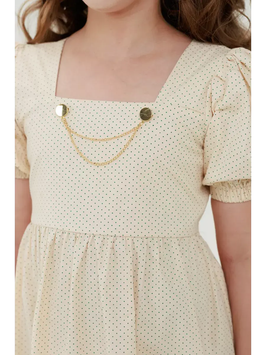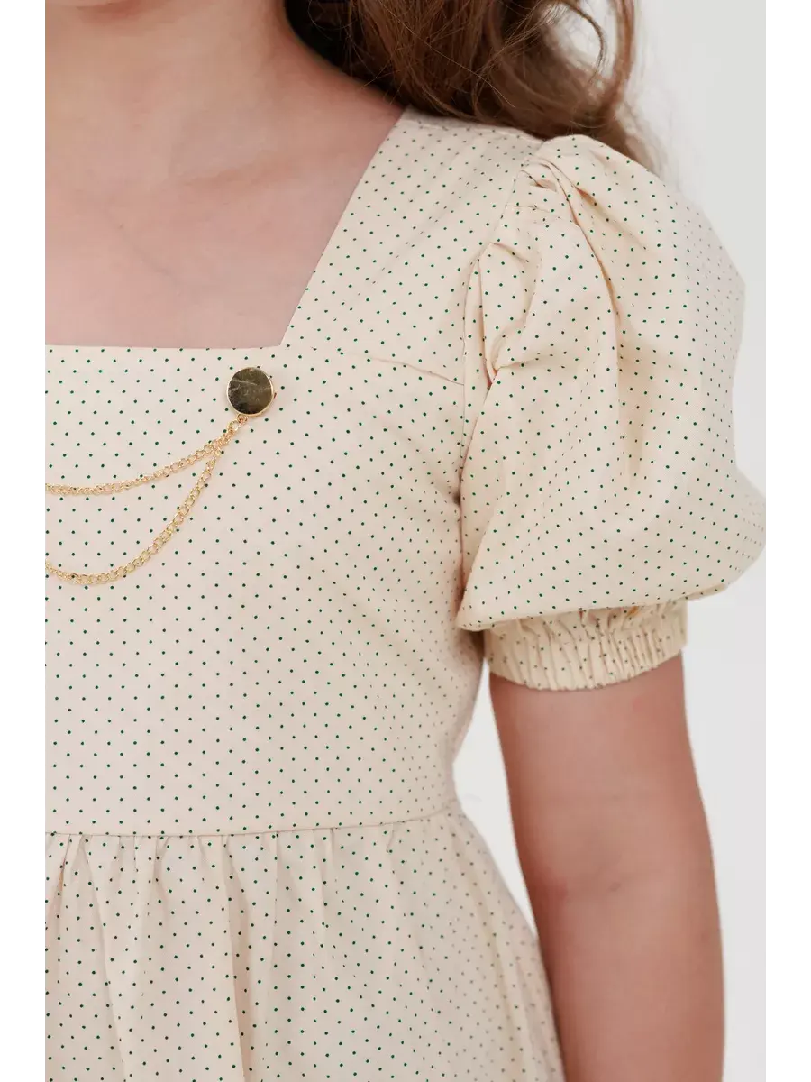 Это платье подойдет как для выпускного в детском саду, так и для утренника в школе. Пышный короткий рукав и пастельные цвета делают его невероятно нарядным и модным. Цепь спереди добавляет изысканности, а вырез на спинке сделает образ вашей девочки оригинальным.